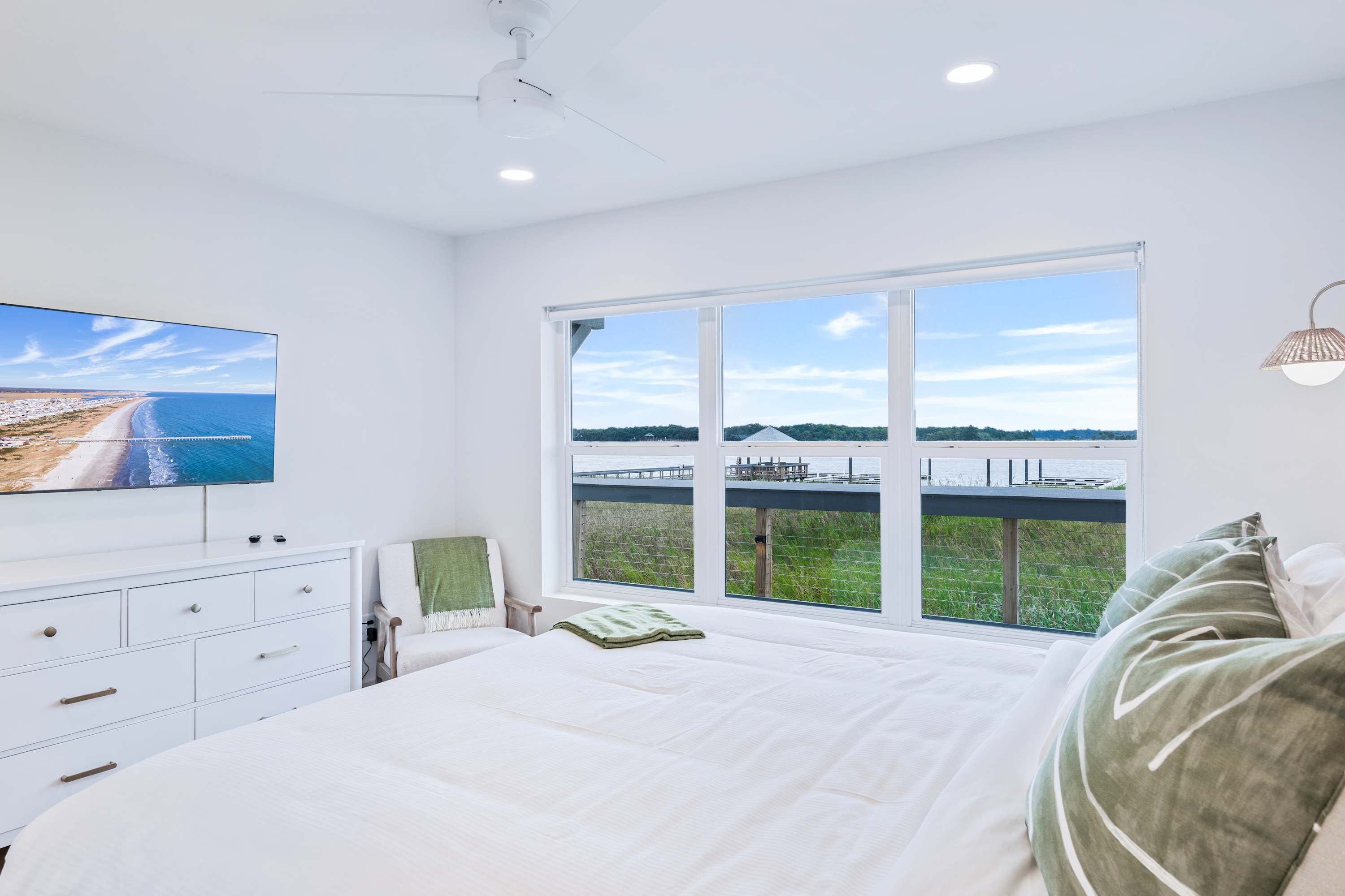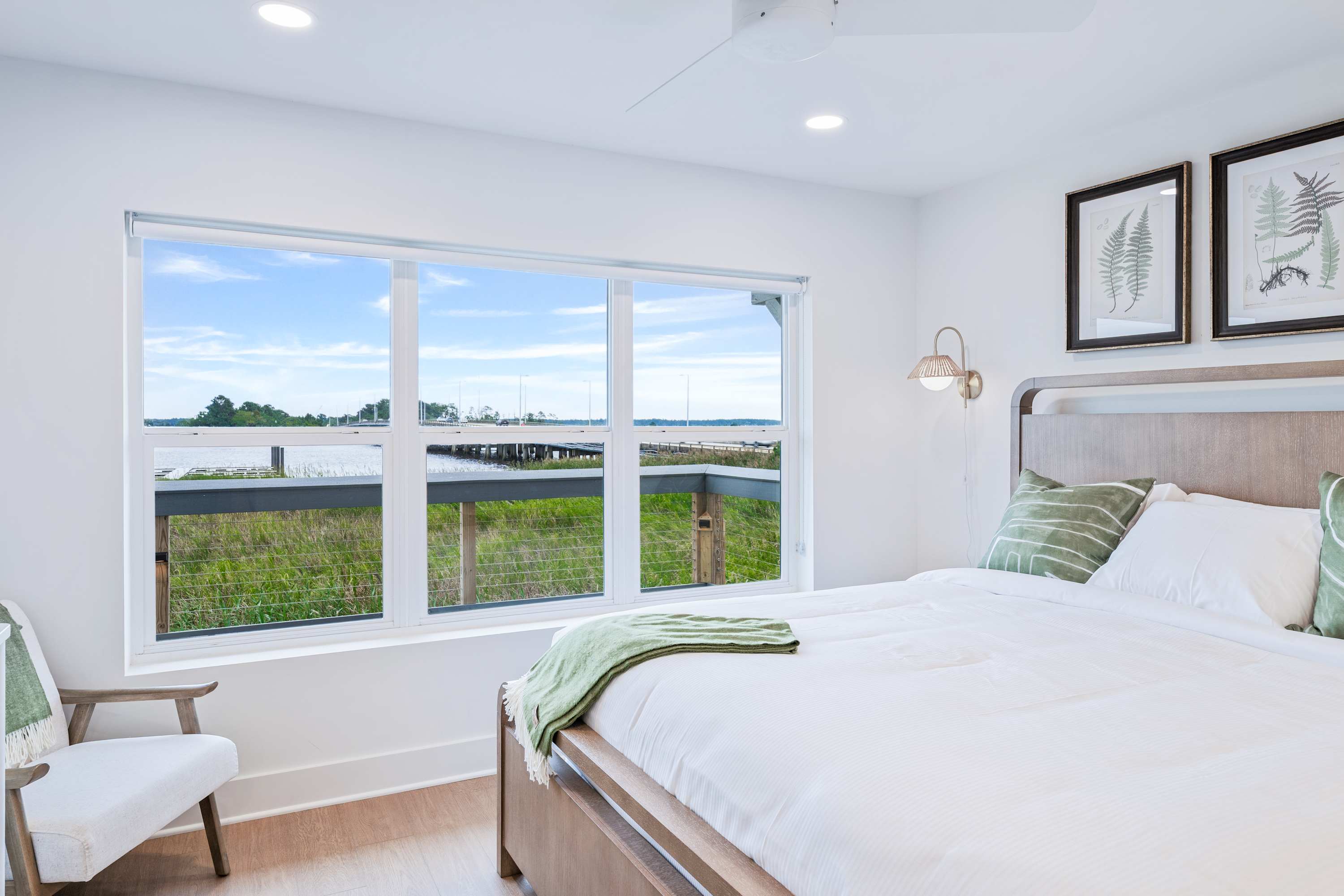 - Master Bedroom: King bed with serene water views.