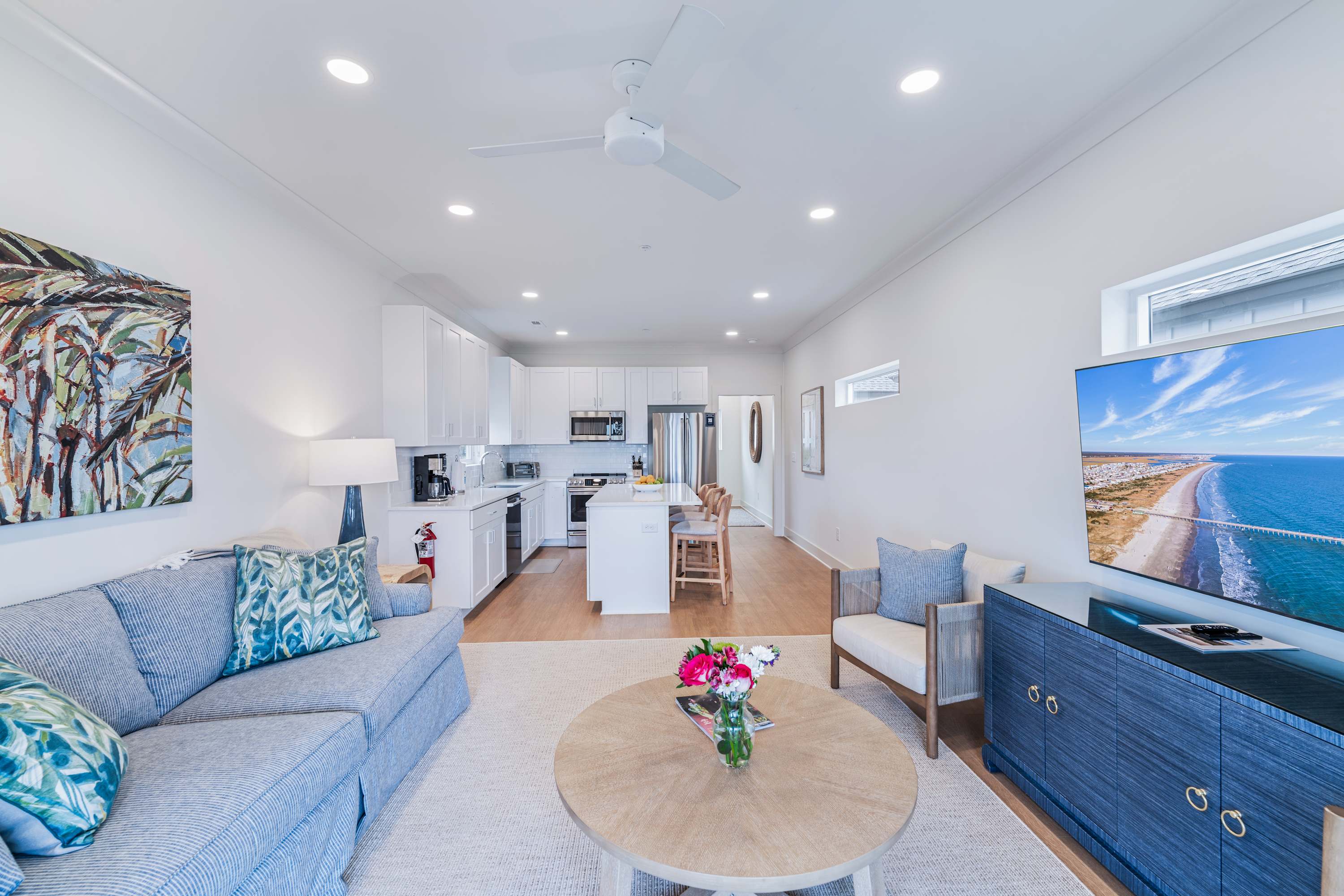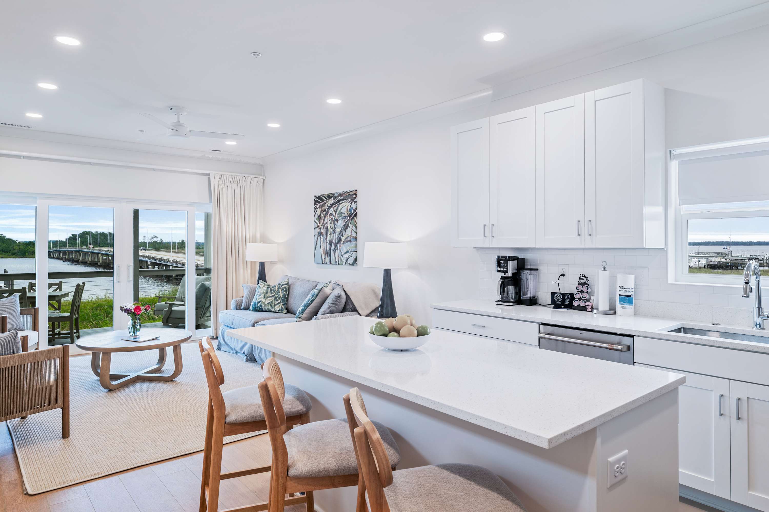 - A modern, fully equipped all-white kitchen with a dishwasher, oven, coffee maker, and blender.